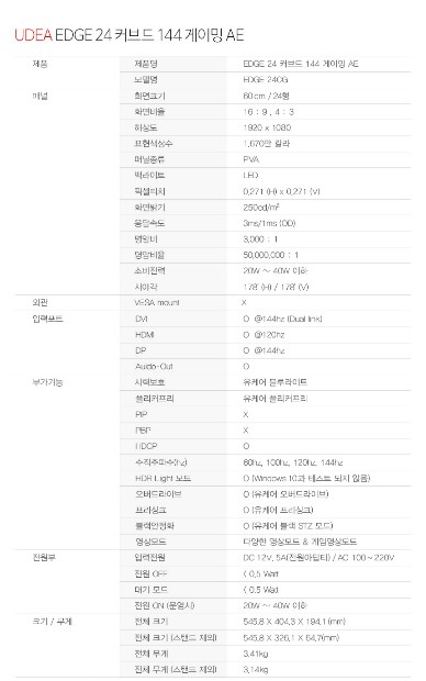 제이씨현 UDEA EDGE 24 커브드 144 게이밍 AE 블랙 무결점입니다.